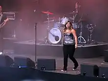 Clarkson performed "Mr. Know It All" for the first time on Stars for Free music festival in Berlin, Germany on September 10, 2011.[33] She then performed it on The Tonight Show with Jay Leno on September 20, 2011. Upon hearing Clarkson's performance on The Tonight Show, VH1 remarked, "Clarkson has always had a great voice and an even better sense of how to use it".[34] Clarkson performed the song on The Ellen DeGeneres Show on September 22, 2011, at the iHeartRadio Music Festival in Las Vegas on September 23, 2011, and on the Australian television series The X Factor on September 28, 2011.[35][36][37][38] On October 2, 2011, Clarkson performed the song at the 2011 NRL Grand Final at the ANZ Stadium in Sydney, Australia where she was accompanied by 300 dancers.[39][40][41] Clarkson also performed the song on Dancing With The Stars on October 18, 2011, along with her hit Walk Away.[42] Clarkson performed "Mr. Know It All" during the third live results show of season 8 of the British television series The X Factor on October 23, 2011, and is scheduled to perform the song on the U.S. series of The X Factor on November 23, 2011. Clarkson performed the song on The Today Show on October 25, 2011, on The View on October 26, 2011, and on Late Night with Jimmy Fallon on October 28, 2011.[43] Clarkson performed "Mr. Know It All" at the 2011 American Music Awards.[44][45] On January 7, 2012, she performed it on Saturday Night Live. Clarkson performed the acoustic version of "Mr. Know It All" live on stage during the Sony Keynote at CES 2012 in Las Vegas on January 9, 2012. On June 9, 2012, she performed the song at Wembley Stadium as a part of her setlist of Summertime Ball.[46]