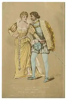 Benedick and Beatrice quickly became the main interest of the play. They are considered the leading roles even though their relationship is given equal or lesser weight in the script than Claudio's and Hero's situation.[17] Charles I wrote, 'Benedick and Beatrice' beside the title of the play in his copy of the Second Folio.[18] The provocative treatment of gender is central and should be considered in its Renaissance context.[19] This was reflected and emphasized in certain plays of the period but was also challenged.[20] Amussen[21] notes that the undoing of traditional gender clichés seems to have inflamed anxieties about the erosion of social order. It seems that comic drama could be a means of calming such anxieties. Ironically, the play's popularity suggests that this only increased interest in such behavior. Benedick wittily gives voice to male anxieties about women's "sharp tongues and proneness to sexual lightness".[20] In the play's patriarchal society, the men's loyalties are governed by conventional codes of honour, camaraderie, and a sense of superiority over women.[20] Assumptions that women are by nature prone to inconstancy are shown in the repeated jokes about cuckoldry, and partly explain Claudio's readiness to believe the slander against Hero. This stereotype is turned on its head in Balthasar's song "Sigh No More", which presents men as the deceitful and inconstant sex that women must abide.
