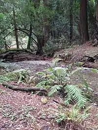 The Muir Woods National Monument is an old-growth coastal redwood forest.[6] Due to its proximity to the Pacific Ocean, the forest is regularly shrouded in a coastal marine layer fog, contributing to a wet environment that encourages vigorous plant growth. The fog is also vital for the growth of the redwoods as they use moisture from the fog during drought seasons, particularly during dry summers.[7]