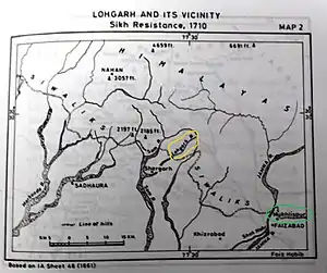 Dr. Khushwant Singh in his book A History of the Sikhs second edition writes on page no 103, Banda was too shrewd to place much reliance on the loyalties of the new converts and he made the old fort of Mukhlisgarh, in the safety of the Himalayas, his headquarters. At Mukhlisgarh, Banda learned that Bahadur Shah, after subjugation of Rajasthan and not likely to return to Delhi before the monsoons. Banda decided to utilize the opportunity to destroy the remaining vestiges of Mughal rule in northern India.
