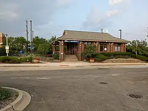Mundelein is a station on Metra's North Central Service in Mundelein, Illinois. The station is 39.6 miles (63.7 km) away from Chicago Union Station, the southern terminus of the line.[3] In Metra's zone-based fare system, Mundelein is in zone H. As of 2018, Mundelein is the 148th busiest of Metra's 236 non-downtown stations, with an average of 276 weekday boardings.[2] Service began on August 19, 1996, but the building was not completed until 1997. The parking lot was expanded later. As with other North Central stations, there is no ticket agent and no weekend service to this station. In addition to train service, it is used for parking for Carmel High School "Street Scenes," and for occasional electronic waste disposal events.