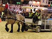 Various names have been coined for the municipal horse: cheval cantonnier, cheval citadin, cheval communal and cheval citoyen. A symposium held in Avignon in 2000 was devoted to the "horse in the city". The term "municipal horse" was made official when the first Congrès national des chevaux territoriaux was held in Trouville-sur-Mer in 2003.[1] At the end of 2012, a mission by the Conseil général de l'alimentation, de l'agriculture et des espaces ruraux (CGAAER) defined the term as "a horse used by a local authority (either on its own account or as a service provider) to carry out public service missions on its territory, such as passenger transport, waste collection, maintenance of green spaces or natural areas, prevention and security...".[2] In Switzerland, the term "urban horse" is used.[2] However, the notion of "municipal horse" remains difficult to define.[3]
