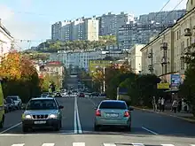 Murmansk (Russian: Мурманск; Kildin Sami: Мурман ланнҍ; Skolt Sami: Muurman[2] and Northern Sami: Murmánska) is a port city and the administrative center of Murmansk Oblast in the far northwest part of Russia. It sits on both slopes and banks of a modest ria or fjord, Kola Bay, an estuarine inlet of the Barents Sea, with its bulk on the east bank of the inlet. It is in the north of the rounded Kola Peninsula which covers most of the oblast. The city is 108 kilometres (67 mi) from the border with Norway and 182 kilometres (113 mi) from the border with Finland.