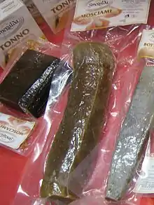 Musciame or mosciame is a traditional Italian preserved meat made from the salted and sun-dried flesh of dolphins. It is black, and looks like a piece of charred wood hanging from a string.[1]:220[2]:16 It was made by the sailors and fishermen of the coast of Liguria and Versilia;[1]:220 under European law, it may no longer be legally produced or sold.[3] A somewhat similar product in Sicily made from fillet of tuna, often sold as "mosciame di tonno", is essentially the same as the mojama de atún of Spain.