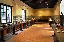 Rooms downstairs such as the kitchen, the refectory, the foyer to the sacristy, the pilgrim’s entrance as well as the garden areas outside have been restored to their original appearance. The kitchen was recreated in 2002, and the refectory, bath area and the foyer were restored in 2005. In addition, a number of other artifacts and spaces have been preserved, such as the excavations of the monastery foundations and its pre-Hispanic predecessors, but they are not available to the public.[1] Most of the preserved downstairs rooms are related to the feeding and other necessities of the monks, such as the kitchen, the dining room and the bath area and generally were not open to the public. The lower cloister, the foyer to the sacristy and the portals were public spaces. There is also fountain inside the main patio that provided water for the monks and the surrounding community. The main garden contained and orchard which grew fruit and other foods for consumption by the monastery’s inhabitants. The "patio menor" on the side of the complex is where monks could converse with those visiting the facility.[3]