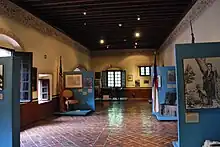 The museum is spread out over ten halls with the intention of explaining the historical processes of each of the military conflicts. It starts with an Introductory Hall at the top of the stairs, which is dedicated to showing the forms of fighting adopted in Mexico and the development of U.S. expansionism. The Hall of Independence contains explanations as to how Mexico gained her independence from Spain to the government of General Guadalupe Victoria from 1810 to 1829. The Spanish Intervention of 1829 Room is dedicated to Spain's attempt to reclaim its former colony as well as U.S. attempts to buy Texas. The room dedicated to the Pastry War (1838–1839), also called the First French Intervention, is dedicated to the conflict between France and Mexico over trade issues and its eventual end through negotiation.[3] The Mexican–American War Room (1846–1848) begins with Mexico's loss of Texas, which then annexed itself to the United States and how conflict over this event eventually led to war between the U.S. and Mexico. It covers how the U.S. invaded Mexican territory and ended with a peace treaty which required Mexico to give up much of its northern territory.[3] Displays include the Texan flag flown at the Alamo and U.S. military maps of the 1847 battle in Churubusco, noting how much the monastery was separated from the city at that time.[2] The (Second) French Intervention in Mexico (1862–1867) is represented in a room which focuses on the role of President Benito Juarez in the conflict. This is then followed by a room dedicated to the "Restored Republic." It focuses on how the interventions up until that time shaped the Republic and how Mexico entered the world market as a supplier of raw materials.[3]