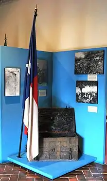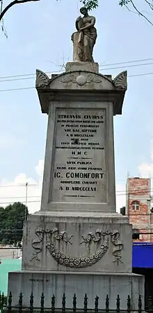 The Mexican Army dislocated the monks living here during the Mexican-American War in order to defend Mexico City from the invading U.S. Army. The Mexicans fortified the building, which included building the parapet.[4] At the time, the complex was far outside the city limits. On 20 August 1847, Battle of Churubusco was fought. When the Mexicans ran out of ammunition, the battle turned to hand-to-hand fighting. When the Mexicans were defeated U.S. General David Twiggs asked General Pedro María de Anaya to surrender his ammunition. The reported response of Anaya is "If there was any, you wouldn't be here."[2] This was also the last stand of Saint Patrick's Battalion, a regiment of mostly Irish defectors from the U.S. army. A plaque honoring them is placed at the main entrance.[1] In 1869, President Benito Juárez declared the site a national monument in honor of the battle,[3] which was reaffirmed in 1933.[4] However, this did not turn it into a museum. From 1876 to 1914, it served as a military hospital, specializing in contagious diseases. In the 1920s, it was an art school, and from 1920 to 1960 it was a depot.[2] In the 1960s and 1970s, this building was known unofficially as the Transport Museum as a large number of old vehicles were stored there. This collection was eventually sent to Zacatecas in 1985.[3]