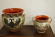 Bandera, which means "flag" in Spanish, is so named because it has the green-red-and-white colors of the Mexican flag.[10] Red is commonly used as the background color, while the green and white are used for the decorative details.[8] It is also an unglazed burnished ware. For unknown reasons, this style of pottery is very rare.[12] One uncommon ware is called engregado. These objects have a special varnish that make them useful for cooking, the varnish acting like a coating of Teflon that prevents food from slicking when heated.[10]