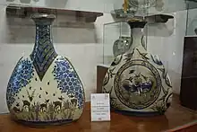 The barro bruñido tradition is represented with flasks, pots, jars and storage containers from Tonalá.[2] This is the best known ceramic style from the area, probably descended from polychrome pottery produced from the 19th century. The name comes from the fact that these pieces are not glazed, but rather they are given a slip and then polished with a stone or pyrite. Many of these pieces are slender necked jugs or lamp bases, often decorated with animals, such as rabbits, with distorted characteristics, giving them a surreal look. The pieces are usually painted with delicate tones of rose, gray-blue and white on a background of a light coffee color, light gray and sometimes green or blue. Each piece is individually created. The attraction of this pottery is its appearance, as it is too porous to hold any liquid or food. One exception is a water container with a fat body and long neck, with a ceramic cup placed upside down over the neck. These are called botellones are carafes.[8][9] Most of the pieces with the oldest designs are in barro bruñido, which include pieces with antique floral motifs in indigo and countryside scenes depicting the Valley. Also in the bruñido category are two very large plates by Amado Galvan, a potter from first half of the 20th century who gained fame for his designs which imitate the art of the 19th century.[4][5]