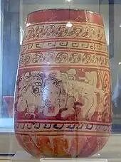 The vase was a drinking vessel for chocolate and depicts a mythological scene featuring what looks like the moon goddess,[15] but is more likely the tonsured maize god, who, functioning as a lunar deity, carries a rabbit in his arms.[16] The god is seated upon a throne, which is decorated with a celestial band.[15] Below him are three jars of pulque.[15] Only about half of the original scene has survived, and the text next to the maize god is illegible.[15] Only slight traces remain of a second person seated upon the same throne, to the left of the maize god.[15] Two rows of supernatural beings are seated on the floor before the throne, indicating that they are visiting the enthroned principal figures.[17] Three of these visitors can be identified, including two versions of God N, represented as separate individuals, and a being that is a man-bird hybrid.[17] These figures are also accompanied by hieroglyphs, although they are also illegible.[17] The vase includes a dedicatory hieroglyphic text around the rim that identifies it as the drinking vessel of a lord of the city of Naranjo.[17]