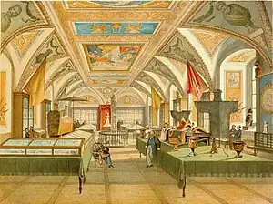 The museum opened with a much narrower focus on history and archaeology than originally planned by Tyszkiewicz.[1] The museum was given premises in the former Vilnius University (closed in 1831) – the present-day Hall of Pranciškus Smuglevičius (Franciszek Smuglewicz) of Vilnius University Library. The former assembly hall was restored taking care to clean up and renew paintings and frescoes by Smuglewicz. The museum expanded to the 2nd (former Jesuit library) and 3rd floors (former university cabinet of mineralogy) in 1856–1857.[4] The second floor was tuned into a library and an ornithological museum (basis for which were exhibits collected by Konstanty Tyzenhauz). The third floor inherited more than 10,000 minerals and related items from the former university and became a mineralogy and natural history museum.[4] Though the natural history section was large, it never became the focus of the museum.[1] The museum rapidly increased its collections. Items were donated by history enthusiasts, various societies and organizations. The museum registered 195 donors in 1858 and 323 donors in 1862.[3] The collection grew from initial 6,000 items donated by Eustachy Tyszkiewicz to over 67,000 items by 1865.[7][8]