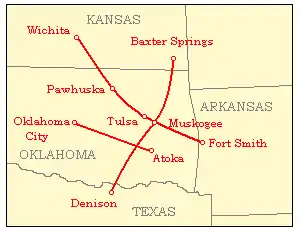 The Kansas, Oklahoma & Gulf Railroad was a nearby line that had twice gone into receivership.[2] That railway ran from Denison, Texas to Baxter Springs, Kansas.[4] Ownership passed into the hands of the Muskogee Company in 1926, and the line was soon generating a profit.[2][4]