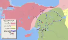 According to the Arabic sources, the first Arab expedition reached Armenia in 639/640, on the heels of their conquest of the Levant from the Byzantines and the start of the Muslim conquest of Persia.[1] The Arabs were led by Iyad ibn Ghanim, who had previously conquered Upper Mesopotamia, and penetrated as far as Bitlis. A second expedition occurred in 642, when the Muslim army advanced and divided into four corps up to northeastern Anatolia, only to be defeated and pushed out of the country.[1] After this setback, the Arabs only undertook a raid from Caucasian Albania in 645, led by Salman ibn Rabiah, but this only touched the Anatolian borderlands.[1] It was not until 645/646 that a major campaign to subdue the country was undertaken by Mu'awiya, the governor of Syria. Mu'awiya's general Habib ibn Maslama al-Fihri first moved against the Byzantine portion of the country: he besieged and captured Theodosiopolis (present-day Erzurum, Turkey) and defeated a Byzantine army, reinforced with Khazar and Alan troops, on the Euphrates. He then turned towards Lake Van, where the local Armenian princes of Akhlat and Moks submitted, allowing Habib to march onto Dvin, the capital of the former Persian portion of Armenia. Dvin capitulated after a few days of siege, as did Tiflis further north in Caucasian Iberia.[3] During the same time, another Arab army from Iraq, under Salman ibn Rabi'a, conquered parts Caucasian Iberia (Arran).[3]