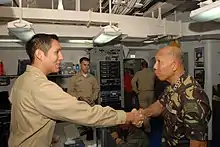 General Alexander B. Yano, Chief of Staff of the Armed Forces of the Philippines shakes hands with Lieutenant Junior-Grade Eduardo Vargas on the USS Ronald Reagan.