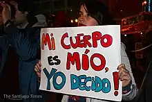 According to Suzannah Weiss, the slogan, "My body, my choice" is a feminist idea which can be applicable to women's reproductive rights and other women's rights issues.[9] It is also the opposite to treating women's bodies like property, and asserts the importance of a culture of consent.[9] Rameeza Ahmad describes how the Pakistani version of "my body, my choice," "Mera Jism Meri Marzi," is important to feminists because it is important for women to know they have control over their own bodies.[10] Kristin Rowe-Finkbeiner writes that while it seems simple that women's freedom is linked to women's own control and decisions about their own bodies, in practice the slogan of 'My body, my choice' is too often changed to mean of "not really your body, not really your choice." and women's rights like access to birth control, abortion, and reproductive health are attacked.[11]