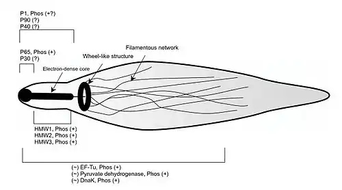 Adherence of M. pneumoniae to a host cell (usually a respiratory tract cell, but occasionally an erythrocyte or urogenital lining cell) is the initiating event for pneumonic disease and related symptoms.[6] The specialized attachment organelle is a polar, electron dense and elongated cell extension that facilitates motility and adherence to host cells.[6][25] It is composed of a central filament surrounded by an intracytoplasmic space, along with a number of adhesins and structural and accessory proteins localized at the tip of the organelle.[6][25] A variety of proteins are known to contribute to the formation and functionality of the attachment organelle, including the accessory proteins HMW1–HMW5, P30, P56, and P90 that confer structure and adhesin support, and P1, P30 and P116 which are involved directly in attachment.[6][32][33] This network of proteins participates not only in the initiation of attachment organelle formation and adhesion but also in motility.[33] The P1 adhesin (trypsin-sensitive protein) is a 120 kDa protein highly clustered on the surface of the attachment organelle tip in virulent mycoplasmas.[6][33][34] Both the presence of P1 and its concentration on the cell surface are required for the attachment of M. pneumoniae to the host cell. M. pneumoniae cells treated with monoclonal antibodies specific to the immunogenic C-terminus of the P1 adhesin have been shown to be inhibited in their ability to attach to the host cell surface by approximately 75%, suggesting P1 is a major component in adherence.[6][32][33] These antibodies also decreased the ability of the cell to glide quickly, which may contribute to decreased adherence to the host by hindering their capacity to locate a host cell.[32] Furthermore, mutations in P1 or degradation by trypsin treatment yield avirulent M. pneumoniae cells.[6] Loss of proteins in the cytoskeleton involved in the localization of P1 in the tip structure, such as HMW1–HMW3, also cause avirulence due to the lack of adhesin clustering.[33][34] Another protein considered to play an important role in adherence is P30, as M. pneumoniae cells with mutations in this protein or that have had antibodies raised against P30 are incapable of adhering to host cells.[6][25] P30 is not involved in the localization of P1 in the tip structure since P1 is trafficked to the attachment organelle in P30 mutants, but rather it may function as a receptor-binding accessory adhesin.[25][34] P30 mutants also display distinct morphological features such as multiple lobes and a rounded shape as opposed to elongated, which suggests P30 may interact with the cytoskeleton during formation of the attachment organelle.[25] A number of eukaryotic cell surface components have been implicated in the adherence of M. pneumoniae cells to the respiratory tract epithelium. Among them are sialoglycoconjugates, sulfated glycolipids, glycoproteins, fibronectin, and neuraminic acid receptors.[6][32][35] Lectins on the surface of the bacterial cells are capable of binding oligosaccharide chains on glycolipids and glycoproteins to facilitate attachment, in addition to the proteins TU and pyruvate dehydrogenase E1 β, which bind to fibronectin.[6][32]