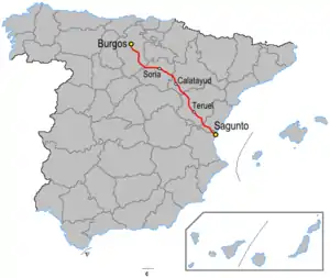 At Soria the road meets the N-111 and N-122. The road continues south east into the Sierra de la Virgen and the Puerto Bigornia (1,100m). At Calatayud there is a junction with the Autovía A-2. The road follows the Jiloca River to Daroca and a junction with the N-330 crossing the Puerto de Villafeliche (860m).