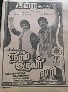 Naam Iruvar (transl. We Two) is a 1985 Indian Tamil-language film, directed by R. Krishnamoorthy and produced by AVM Productions. The film stars Sivaji Ganesan, Prabhu, Urvashi and Charle.[1] It is a remake of the Kannada film Ramapurada Ravana,[2] and was Ganesan's 250th film as an actor.[3]