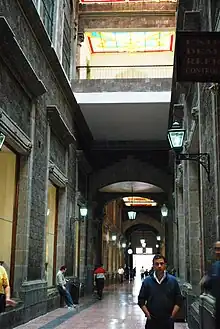 Operations began in 1775 in the College of Saints Peter and Paul and where the current main office is now.[6] In 1818, Don Viceroy Apodaca ordered the evacuation of the building due to problems with the Independence movement but this did not happen until 1821, when King Ferdinand VII confiscated Jesuit properties.[1] The foundation moved to the Franciscan Convent of Saint Bridget that was on Juárez Avenue and San Juan de Letrán Street (now Eje Central).[1][6] It moved again in 1836 to two houses on Empedradillo Street off a difference section of the Zocalo that were owned by the Duke of Monteleone,[6] a descendant of Hernan Cortés.[4] Some time after the College of Saints Peter and Paul moved to what is now the Colegio de San Ildefonso, the Monte de Piedad bought the old college structure and its original home from the Duke of Monteleone in 1836.[3][4][6]