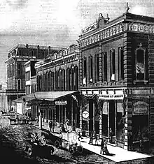 On August 2 of the following year, the Great Fire of 1873 started at a furniture store on Front.[9] The area damaged by the 1872 fire acted as a buffer, aiding in containment efforts.[15] In spite of this, over 20 blocks were destroyed.[16] The prevalence of wood as a building material was a large factor in the fire's spread, and efforts to rebuild the affected area heavily employed brick and iron in an intentional effort to improve construction quality.[9] Builders also became increasingly focused on architectural aesthetics, and by the 1880s, both sides of Front's commercial core were lined with multi-story buildings featuring decorative cast iron fronts and wooden colonnades.[10]