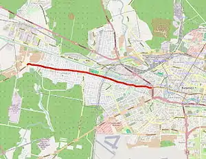 Nakielska street extends east-west, from Grunwaldzka roundabout and junction with Focha Street to the intersection with Łochowska street near the western border of Bydgoszcz. Its length is about 5.4 km. The street is one of the main thoroughfares leading to the center of Bydgoszcz, connecting the western neighborhoods of the city situated on the south side of Bydgoszcz Canal.