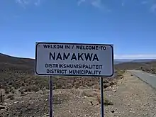 A sign along the border of Namakwa with the Western Cape, welcoming drivers coming up R354