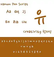The Nanum fonts (Korean: 나눔글꼴; RR: Nanum Geulkkol) is a series of open source unicode fonts designed for the Korean language, designed by Sandoll Communications (Korean: 산돌 커뮤니케이션) and Fontrix (Korean: 폰트릭스). It includes a sans serif (gothic), serif (myeongjo), monospace (coding), pen script, and brush script typefaces. It was published and distributed by Naver.[1]