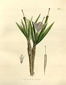 - ↑ Martius, Carl Friedrich Philipp von. 1823. Nova genera et species plantarum :quas in itinere per Brasiliam MDCCCXVII-MDCCCXX jussu et auspiciis Maximiliani Josephi I., Bavariae regis augustissimi instituto 1: plate 9 color illustration, using basionym Vellozia plicata Mart.