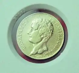 Napoleon tried to unify Europe and almost succeeded, especially in terms of the coinage.[16] The Napoleon coin was first authorized by a Monetary Ordinance of 28 March 1803 by the Premier Consul (First Consul) Napoleon Bonaparte.[17] The 20 franc gold pieces which he authorized in 1803, became the model of all the coins of the Latin Monetary Union which circulated in Europe until 1914. The French coin carries the effigy, in profile, Napoleon, who would later become the French Emperor. The coins had the same value as the Louis, which bears the likeness of the pre-French Revolution King Louis XIV. For Napoleon, there were ostensibly seven types or varieties of the coins minted. In general the varieties differed in terms of obverse legend, reverse legends, portraiture, and calendaring system. For each variety, there was a new enabling statute or executive decree: 28 March 1803; 7 April 1803; 26 June 1804; 8 September 1805; 11 February 1807; 5 August 1807; and 22 October 1808. By extension, the term Napoleon is applied today to all the various types of 20 franc French gold pieces.