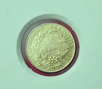 The Napoléon is the colloquial term for a former French gold coin. The coins were minted (at various times) in denominations of 5,[1] 10,[2] 20,[3] 40,[4] 50,[5] and 100[6] francs. This article focuses on the 20 franc coins issued during the reign of Napoléon Bonaparte, which are 21 mm in diameter, weigh 6.45 grams (gross weight) and, at 90% pure, contain 0.1867 troy ounces (5.807 g) of pure gold. The coin was issued during the reign of Napoleon I and features his portrait on the obverse. The denomination (known as the Franc Germinal) continued in use through the 19th century and later French gold coins in the same denomination were generally referred to as "Napoléons". Earlier French gold coins are referred to as Louis (the name of eighteen French kings) or écu (an old French word for shield). Gold Napoléons have historically proven more resilient than other gold coins to economic forces, such as after the Suez crisis when unlike other coins Napoléons did not weaken.[7]
