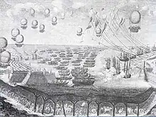 Napoleon also seriously considered using a fleet of troop-carrying balloons as part of his proposed invasion force and appointed Marie Madeline Sophie Blanchard as an air service chief, though she said the proposed aerial invasion would fail because of the winds.[4] (France's first military balloon had been used in 1794 by Jean-Marie Coutelle.[5]) Though an aerial invasion proved a dead-end, the prospect of one captured the minds of the British print media and public.