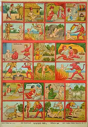 The Yajnavalkya Smriti also lists twenty-one: Tamisra, Lohasanku, Mahaniraya, Salamali, Raurava, Kudmala, Putimrittika, Kalasutraka, Sanghata, Lohitoda, Savisha, Sampratapana, Mahanaraka, Kakola, Sanjivana, Mahapatha, Avichi, Andhatamisra, Kumbhipaka, Asipatravana and Tapana.[12] The Bhagavata Purana, the Vishnu Purana and the Devi Bhagavata Purana enlist and describe 28 hells; however, they end the description by stating that there are hundreds and thousands of hells.[3][4][5][13] The Bhagavata Purana enumerates the following 28: Tamisra, Andhatamisra, Raurava, Maharaurava, Kumbhipaka, Kalasutra, Asipatravana, Sukaramukha, Andhakupa, Krimibhojana, Samdamsa, Taptasurmi, Vajrakantaka-salmali, Vaitarani, Puyoda, Pranarodha, Visasana, Lalabhaksa, Sarameyadana, Avichi, Ayahpana, Ksharakardama, Raksogana-bhojana, Sulaprota, Dandasuka, Avata-nirodhana, Paryavartana and Suchimukha.[3] The Devi Bhagavata Purana agrees with the Bhagavata Purana in most of names; however, a few names are slightly different. Taptasurmi, Ayahpana, Raksogana-bhojana, Avata-nirodhana, Paryavartana are replaced by Taptamurti, Apahpana, Raksogana-sambhoja, Avatarodha, Paryavartanataka respectively.[4] The Vishnu Purana mentions the 28 in the following order: Raurava, Shukara, Rodha, Tala, Visasana, Mahajwala, Taptakumbha, Lavana, Vimohana, Rudhirandha, Vaitaraní, Krimiśa, Krimibhojana, Asipatravana, Krishna, Lalabhaksa, Dáruńa, Púyaváha, Pápa, Vahnijwála, Adhośiras, Sandansa, Kalasutra, Tamas, Avichi, Śwabhojana, Apratisht́ha, and another Avichi.[5]