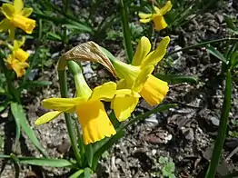 Narcissus 'Tête-à-tête' is a hybrid cultivar of Narcissus, which was introduced in 1949.[1] It is one of 110 cultivars produced by British daffodil breeder Alec Gray.[2] 'Tête-à-tête' is a popular ornamental plant, which is known for its very early flowering period and short stature.[3] This cultivar is commonly used as a garden plant where it can be planted in pots,[4] rock gardens, garden borders[5] and even naturalized in lawns.[6] The cultivar name 'Tête-à-tête' means to have a conversation between two people,[7] which relates to the cultivar often hosting a pair of flowers per stem.[8]