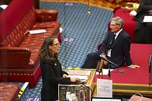 Evans served as a government whip in the House of Lords during the 2015 government, and spoke briefly in January 2016 about how "education must be at the heart of our prison system if we are to rehabilitate effectively".[15][16] On 14 July 2016 Baroness Evans was appointed to the post of Leader of the House of Lords by then prime minister, Theresa May.[17] She remained in that office when Boris Johnson became Prime Minister in July 2019.