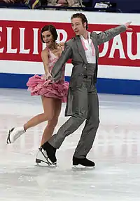 At the 2012 European Championships, Péchalat/Bourzat were second after the short dance, but rallied in the free dance to win their second consecutive European title.[29] Péchalat sustained a broken nose in training on 13 March.[30][31] She said: "We just made a mistake during our twizzles, and I got knocked out."[32] She began wearing a mask but decided to delay an operation until after the 2012 World Championships.[32][33] On 25 March, Péchalat/Bourzat confirmed they would compete at the event and said surgery would not be necessary.[34] At the World Championships, they recorded a season's best score in the short dance[35] and a personal best score in the free dance on their way to winning the bronze, their first World medal.