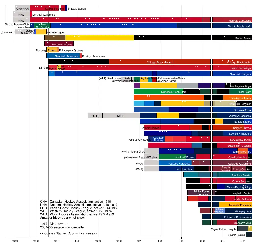 The NHL replaced the NHA as one of the leagues that competed for the Stanley Cup, an interleague competition at the time. Toronto won the first NHL title, and then defeated the Vancouver Millionaires of the Pacific Coast Hockey Association (PCHA) for the 1918 Stanley Cup.[19] The Canadiens won the league title in 1919, but the series in the Stanley Cup Finals against the PCHA's Seattle Metropolitans was abandoned due to the Spanish Flu epidemic.[20] In 1924, Montreal won their first Stanley Cup as a member of the NHL.[21] The Hamilton Tigers won the regular season title in 1924–25, but refused to play in the championship series unless they were given a C$200 bonus.[22] The league refused and declared the Canadiens the league champion after they defeated the Toronto St. Patricks (formerly the Arenas) in the semi-final. Montreal was then defeated by the Victoria Cougars of the Western Canada Hockey League (WCHL) in 1925. It was the last time a non-NHL team won the trophy,[23] as the Stanley Cup became the de facto NHL championship in 1926, after the WCHL ceased operation.[24]