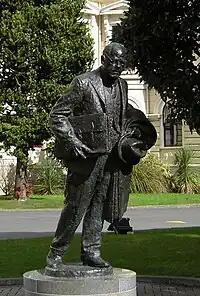 Tarakohe 40°49′16″S 172°54′09″E / 40.8212°S 172.9026°E | The Abel Tasman Monument is a memorial to the first recorded contact between Europeans—led by the Dutch explorer Abel Tasman—and Māori in New Zealand's Golden Bay on 18 and 19 December 1642. It was unveiled on the tercentenary of the encounter by the prime minister, several government ministers, and a Dutch delegation. The monument was designed by the architect Ernst Plischke as an abstracted sail, and consists of a large concrete monolith painted white. Located on a bluff at Tarakohe just east of Pōhara, the land for the monument was gifted by the Golden Bay Cement Company. The dignitaries opened the Abel Tasman National Park the following day and the area holding the monument is part of the national park. As was typical for the 1940s, the original inscription focused on the European experience only and overlooked the Māori perspective, demonstrating Western-centric systemic bias. |
