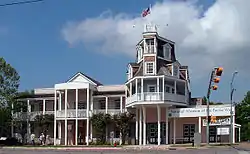 Charles Henry Nimitz, German merchant sailor and grandfather of Fleet Admiral Chester Nimitz, was born in Bremen in Germany. He emigrated to the United States by way of South Carolina in 1844. In 1846, Nimitz moved to Fredericksburg with the initial settlers. In 1848, he married Sophie Dorothea Mueller, and nine of the couple's twelve children lived to adulthood.[2] Local trouble maker James P. Waldrip tried unsuccessfully to recruit Nimitz into Die Haengebande.[3] Charles Nimitz built the Nimitz Hotel in 1852, and deeded it over to his son Charles H. Nimitz, Jr., in 1906. Locals referred to it as the Steamboat Hotel because of the ship's bow front. The hotel had its own saloon and brewery, a ballroom that doubled as a theatre, a smokehouse, and a bath-house.[4] In its heyday, the hotel hosted such guests as Horace Greeley, Johnny Ringo, President Rutherford B. Hayes, General Robert E. Lee, General James Longstreet, General Phil Sheridan, William Sydney Porter and General Ulysses S. Grant.[5][6][7][8][9]