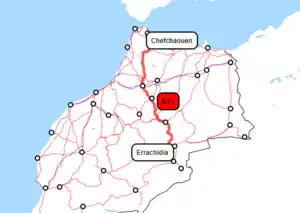 The N13 road is a national highway (Route nationale)[1] in Morocco linking Taouz near Merzouga close to the Algerian border [2] with Azrou, Meknes and other northern locations.[3] North of Meknes there are views of the Zerhoun Mountains and along the N13 is the ancient Roman and Carthaginian settlement of Volubilis, the westernmost provincial capital of the Roman Empire. This Roman city overlies one of the earliest archaeologically recorded Neolithic settlements in Morocco.[4]