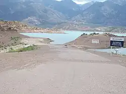 Work started to repair the damaged section of road on 1 February 2006.[19] It used stones brought from a quarry in San Luis Province. The stones were coated with mesh. By July 2006, they had joined up to the basalt stones on both sides of the lake.[20] This allowed trucks to use the track, allowing them to continue with the work of raising the road. The road was to be raised 2 metres above the lake's maximum water level. In normal conditions it would be 6 metres above the lake's surface. The work includes a 60 m bridge in the centre of the lake. It is built in three 20 m sections, each with a lane for both directions of traffic.