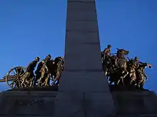 Two 5.33-metre-high (17.5 ft) allegories of peace and freedom stand at the apex of the arch, their proximity to each other representing the inseparability of the two concepts, though, the figure bearing a torch alludes in Roman mythology to Demeter and the winged figure with a laurel depicts Nike, the Greek goddesses of agriculture and victory, respectively.[12] Below are the depictions of 22 Canadian servicemembers from all branches of the forces and other groups engaged in the First World War. At the front, to the left, a Lewis gunner, to the right, a kilted infantryman with a Vickers machine gun. Following these are a pilot in full gear and an air mechanic of the Royal Canadian Air Force, as well as a sailor in the Royal Canadian Navy from HMCS Stadacona. Two mounted figures—a member of the Canadian Cavalry Brigade and a dispatch rider—are emerging from the arch, side by side, followed by two infantry riflemen pressing through the arch and behind them are the men and women of the support services, including two nurses from the Militia Army Medical Corps, a stretcher bearer, and one member each of the Royal Canadian Engineers and the Canadian Forestry Corps. The rear figures are pulling a QF 18-pounder gun. Further, there is one member each of the Canadian Army Service Corps, the Canadian Signals Corps, the Corps of Canadian Railway troops, the Royal Regiment of Canadian Artillery, and the Motor Machine Gun Corps. There are three additional infantrymen; all six carry among them respirators and other items of the "basic load" carried by every member of the infantry.[13][14]