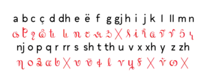 In 1824 or 1825[8] he started the creation of his alphabet of the Albanian language.[12] The final version of his thirty-three-letter Vithkuqi alphabet, whose characters were invented by Veqilharxhi, was printed as part of primer in 1844-5 titled Ëvetari Shqip Fort i Shkurtër ("The most Useful and Concise Albanian Alphabet").[13][12][2] Veqilharxhi avoided the use of Latin, Greek or Arabic alphabets and characters because of their religious associations and the possibility of causing divisions among Albanians of different religions.[14][12] Veqilarxhi's Ëvetar first distributed in Korçë and later westwards as far as Berat, where it reached great success.[15][12][2] It was also circulated in Përmet.[16] On April 22, 1845 Athanas Paskali, one of the notable people of Korçë, along with others sent him a letter requesting as many more copies as possible.[15] Among Albanian historians this publication by Veqilharxhi is considered as the beginning of the Albanian national awakening.[2]