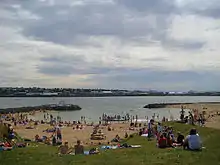 Nauthólsvík (Icelandic pronunciation: [ˈnœytˌhoulsˌviːk], "bull hill bay") is a Seaside resort and a small neighbourhood in Reykjavík, the capital city of Iceland, about 900 metres (3,000 ft) from Perlan. It has a beach with an artificial hot spring – hot water is pumped into a man-made lagoon.[1]