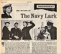![]() The Navy Lark title card featuring photos of (clockwise from top right) Leslie Phillips, Jon Pertwee and Stephen Murray | |