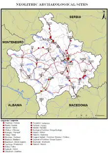 This is a description of Neolithic sites in Kosovo. The warm, humid climate of the Holocene[1] which came soon after the ice melting of the last glacial period brought changes in nature which were reflected in humans, flora and fauna. This climatic stabilization influenced human life and activities; human society is characterized by changes in community organization and the establishment of permanent settlements in dry places, near riverbanks and on fertile plateaus.