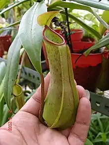 Nepenthes × ferrugineomarginata, lower pitcher with red peristome | |
