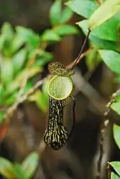 Rosette and lower pitchers are ovate in the basal third to quarter of the pitcher cup, becoming approximately cylindrical above and infundibular towards the pitcher mouth. They are relatively small, growing to only 12 cm in height by 3 cm in width. A pair of wings (≤4 mm wide) typically runs down the ventral surface of the pitcher cup, with fringe elements measuring up to 8 mm in length. These wings may be reduced to ribs in some plants. The glandular region on the inner surface is restricted to the ovate portion of the pitcher cup.[6] The glands are small (0.2–0.3 mm in diameter) and occur at a density of around 150–180 per square centimetre.[2] The waxy zone is well developed[12] and eye spots may occasionally be present on the rear inner surface, visible through the opening.[7] The peristome is sub-cylindrical[6] to cylindrical and up to 4 mm wide. It bears ribs up to 0.1 mm high and spaced 0.2 mm apart, which terminate in teeth up to 0.4 mm long.[7] The inner portion of the peristome accounts for around 51% of its total cross-sectional surface length.[12] The pitcher lid or operculum is ovate and has a cordate base. It measures up to 3 cm in length by 2.5 cm in width and does not bear any appendages. The underside of the lid has an even distribution of small (0.1–0.2 mm in diameter) convex glands, occurring at a density of about 40/cm2.[2] The spur, which is inserted near the base of the lid, is up to 7 mm long and may be simple, forked, or fasciculate[7] with up to 12 branches.[2]