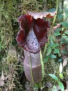 Nepenthes naga is a tropical pitcher plant endemic to the Barisan Mountains of Sumatra. It is characterised by a forked sub-apical appendage on the underside of the lid and an undulate lid margin.[2] The specific epithet naga is the Indonesian word for "dragon" and refers to the distinctive lid appendage of this species as well as the large size of its pitchers. The name also references local folklore, which tells of dragons occurring in this species's habitat in the past.[2]