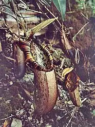 Rosette and lower pitchers are generally ovoid, sometimes being slightly cylindrical in the upper part.[20] They are some of the largest in the genus, reaching 40 cm in height[4] and 15 cm in width.[20] Exceptionally large pitchers can hold more than a quart (946 ml) of fluid.[23] A pair of fringed wings (≤15 mm) runs down the front of the pitcher.[20] The waxy zone of the inner surface is reduced.[24] The pitcher mouth is ovate, slightly raised towards the rear, and has an oblique insertion. The peristome of this species is greatly expanded at the sides (≤25 mm wide) and often has undulate margins. Its inner edge is lined with short but distinct teeth. The lid or operculum is ovate to oblong in shape, lacks appendages, and has an acute apex. An unbranched spur (≤20 mm long) is inserted near the base of the lid. Upper pitchers are similar to their lower counterparts but differ in being infundibular throughout. The wings are often retained in aerial pitchers, although they may be reduced to ribs.[20]