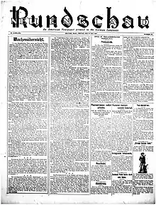 The Neu England Rundschau (New England Review) was a weekly German language newspaper published by The German-American Publishing Company, Wisly Lithograph Company, and subsequently the Wisly-Brooks Company, Inc. of Holyoke, Massachusetts from 1883 until 1942, the longest running German newspaper in Massachusetts.[3] A second edition of the paper was also sold in Connecticut under the masthead Connecticut Staats-Zeitung (Connecticut State Newspaper).[4] Following scrutiny by the US Department of Justice and Office of Strategic Services of the broader German American press, as well as declining circulation, the paper ceased publication in 1942 during the Second World War.[5][4]